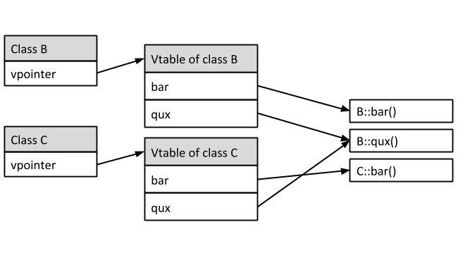 3 | struct C : virtual B { void f(); }; // C::f overrides A::f in C |